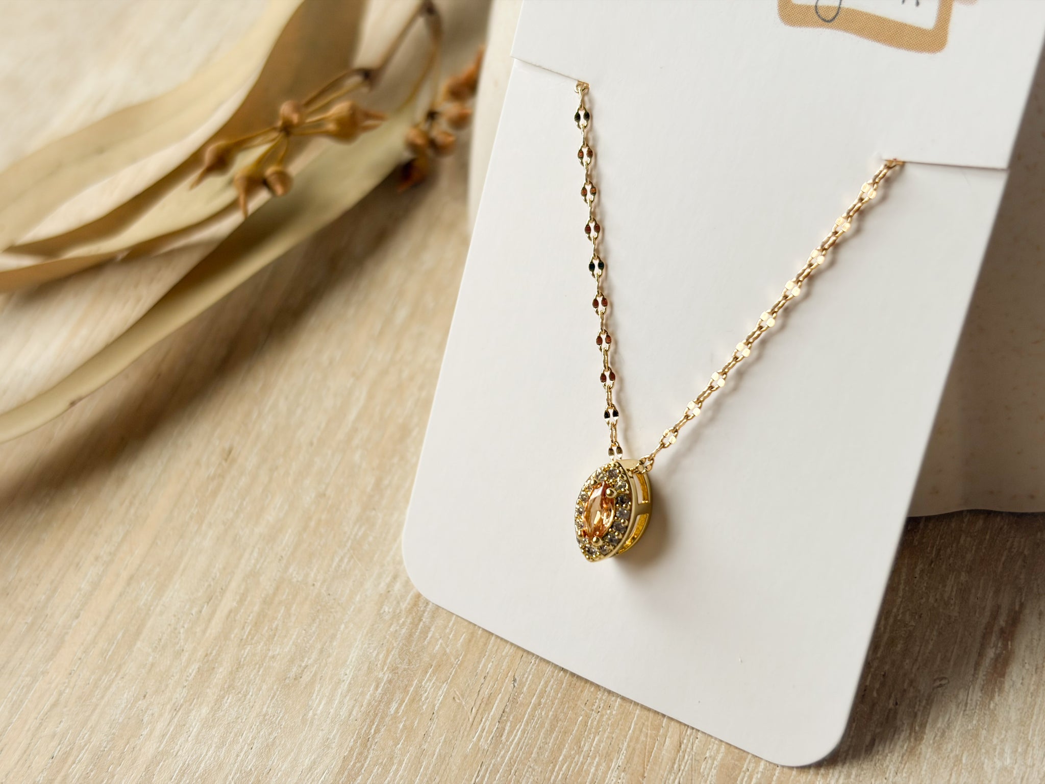 A delicate 18” necklace featuring a shimmery, light-catching chain and a champagne-colored marquise stone that sparkles with soft elegance. Feminine and refined, this piece adds a touch of vintage-inspired charm to any look—perfect for layering or wearing as a subtle statement on its own. Nickel free and designed for everyday shine.