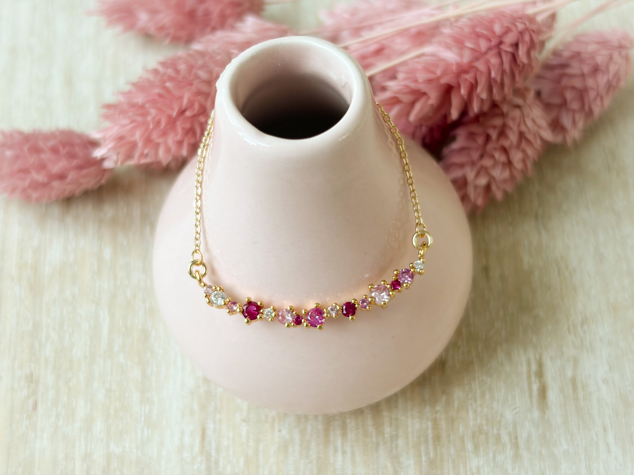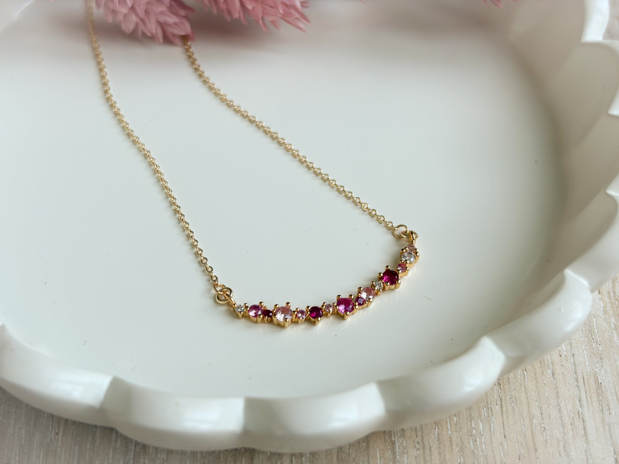This 18” necklace features a sleek curved bar pendant studded with graduated shades of pink cubic zirconia, creating a soft yet eye-catching sparkle. Finished in 14K gold plating and nickel free for comfortable, everyday wear. Perfect worn alone for a refined touch or layered with your favorite chains for a modern look.