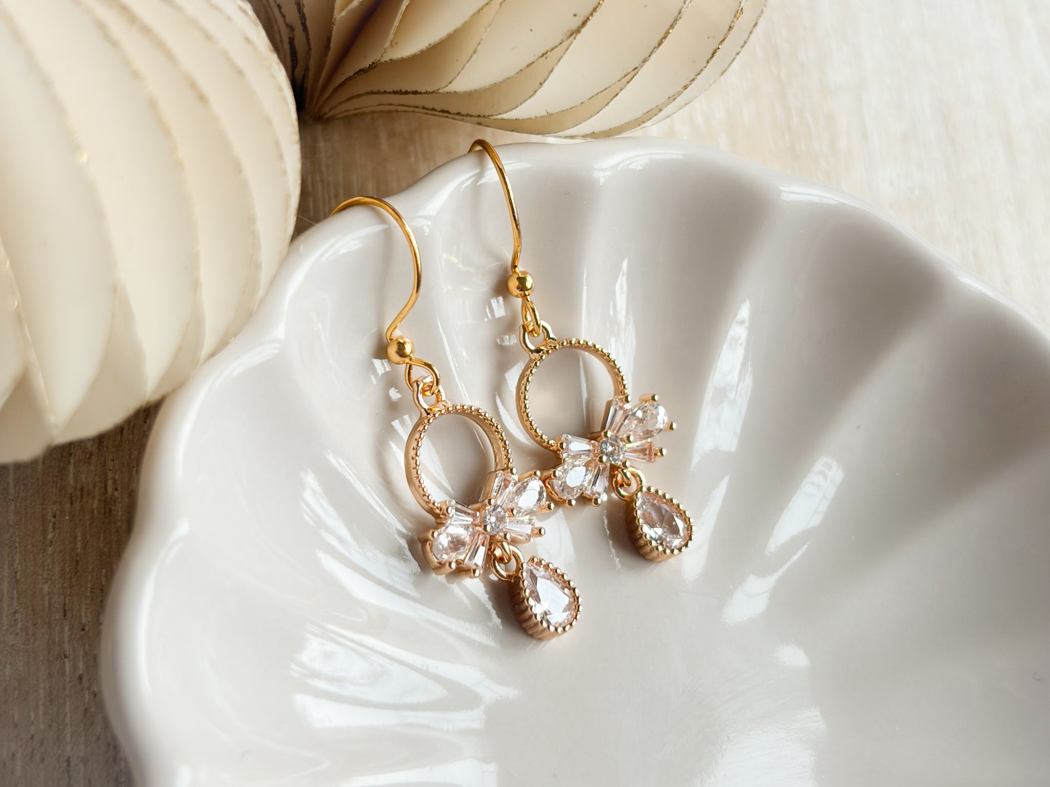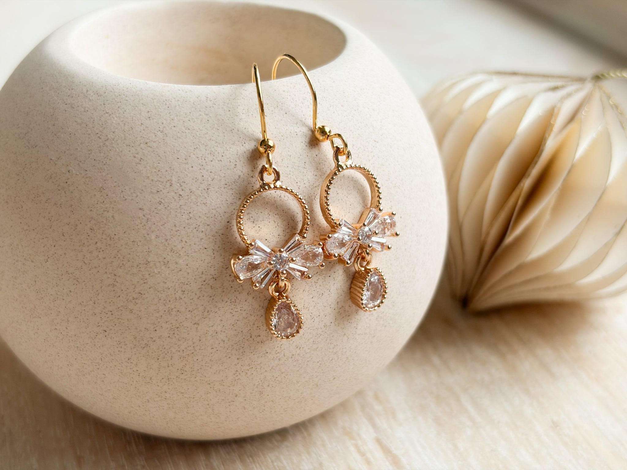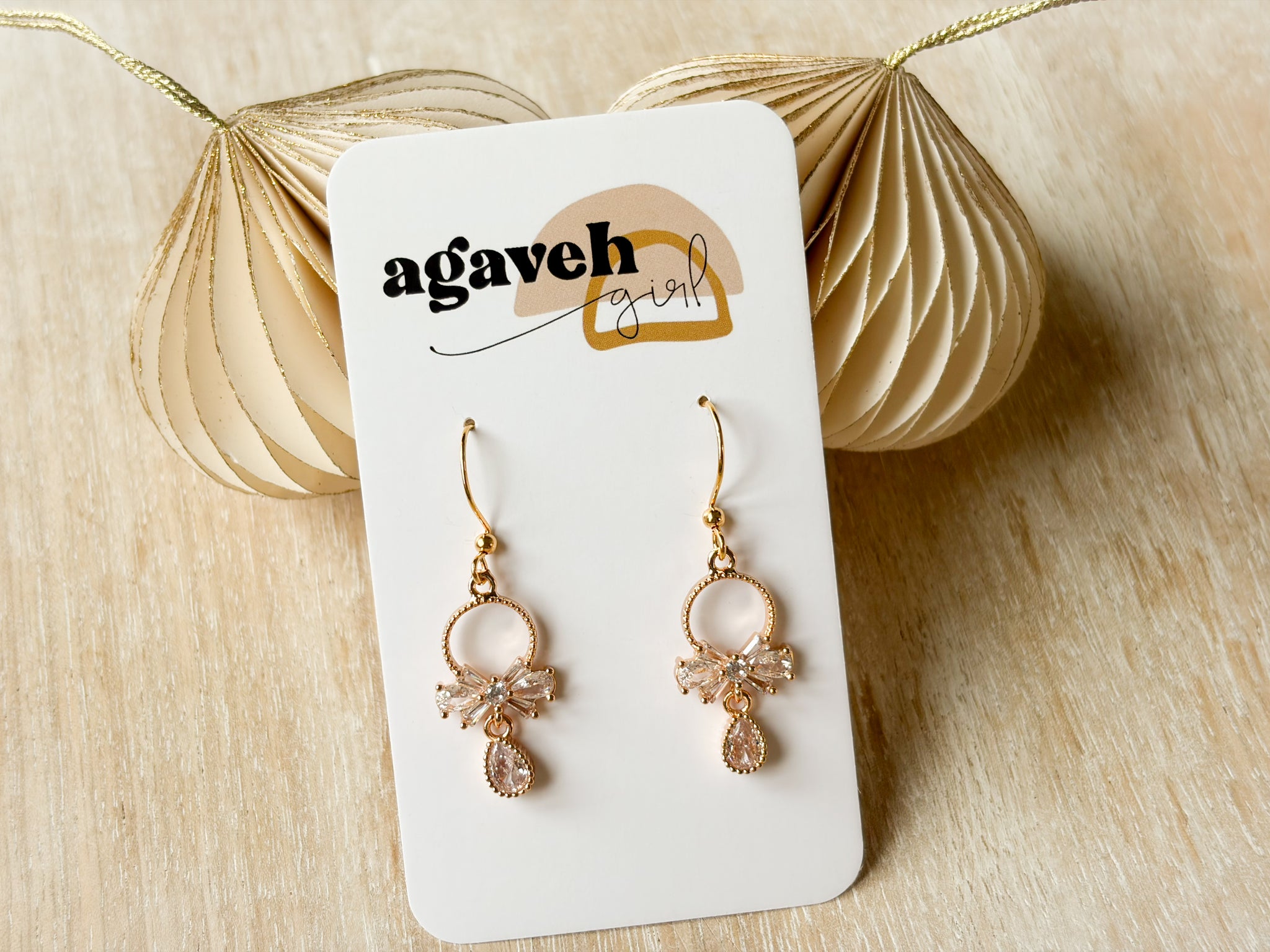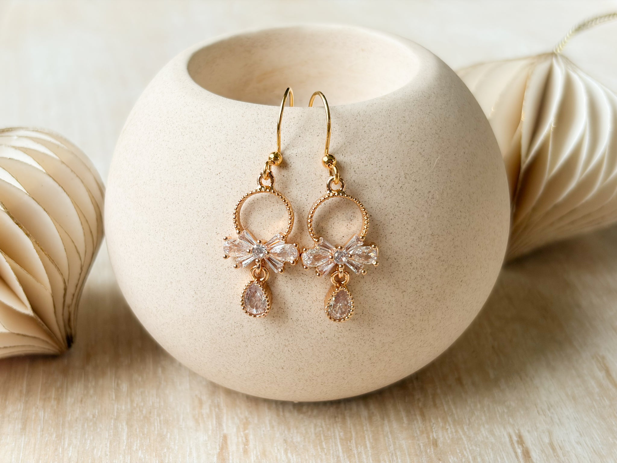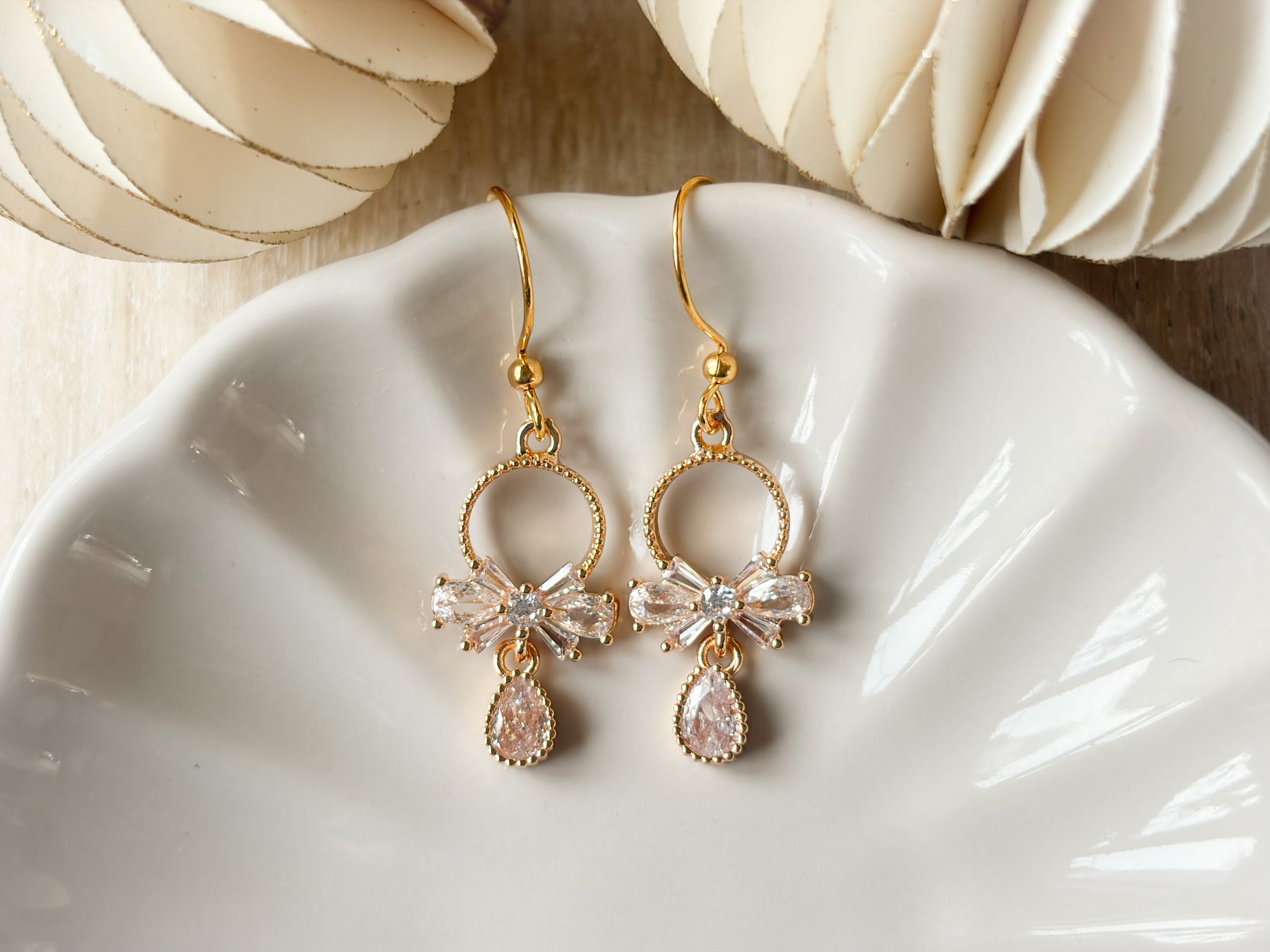 These dazzling dangle earrings feature a sparkling cubic zirconia bow paired with a pear-shaped drop for the perfect touch of glimmer and shine. Crafted with 14K gold plating and completely nickel free, they’re lightweight enough for all-night wear while still delivering a luxurious, fancy finish. The perfect statement piece for holiday parties, New Year’s Eve, or any elegant occasion.