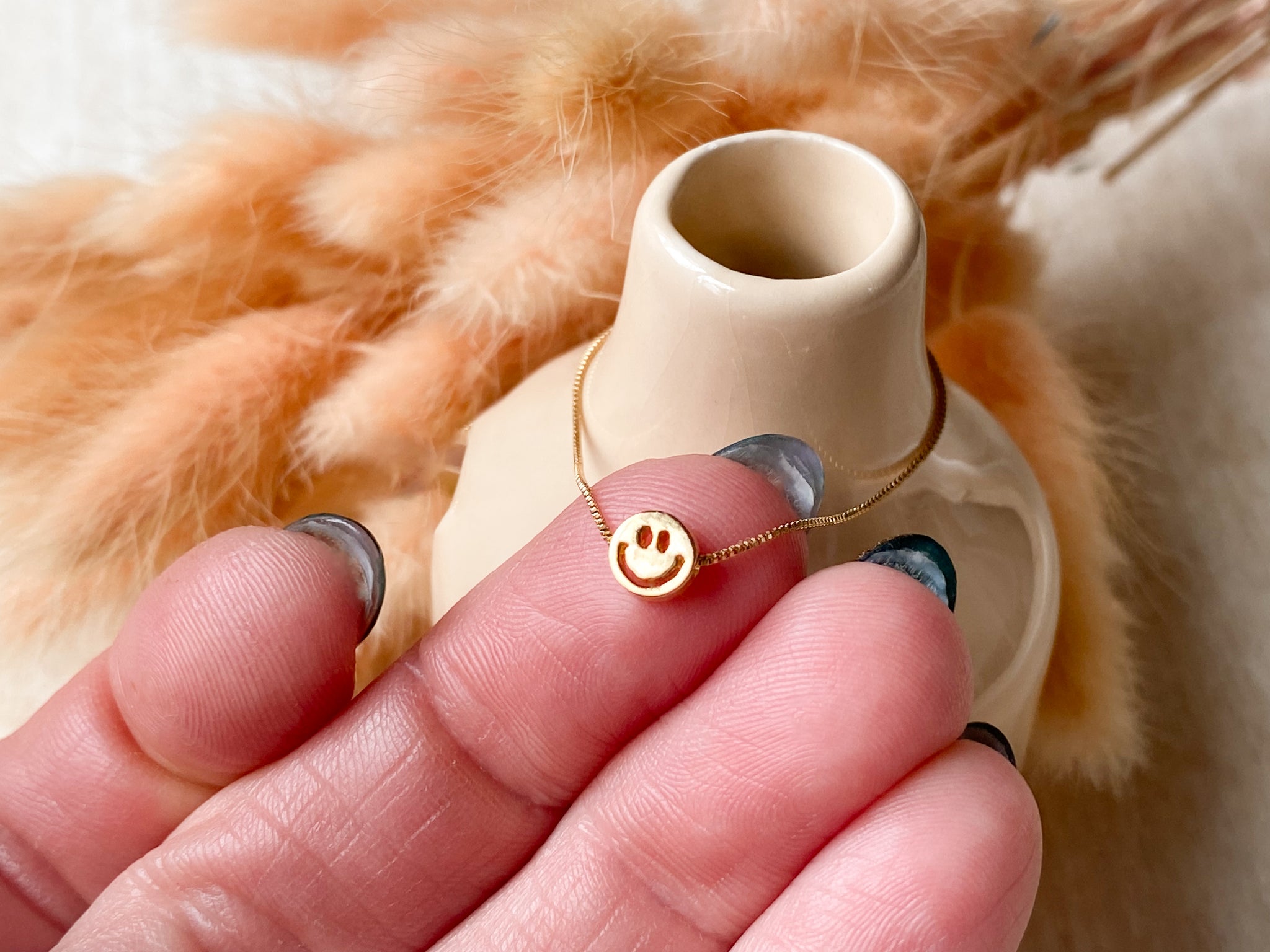 18” 14K gold plated necklace with a happy face charm — a fun, cheerful piece perfect for everyday wear or layering.