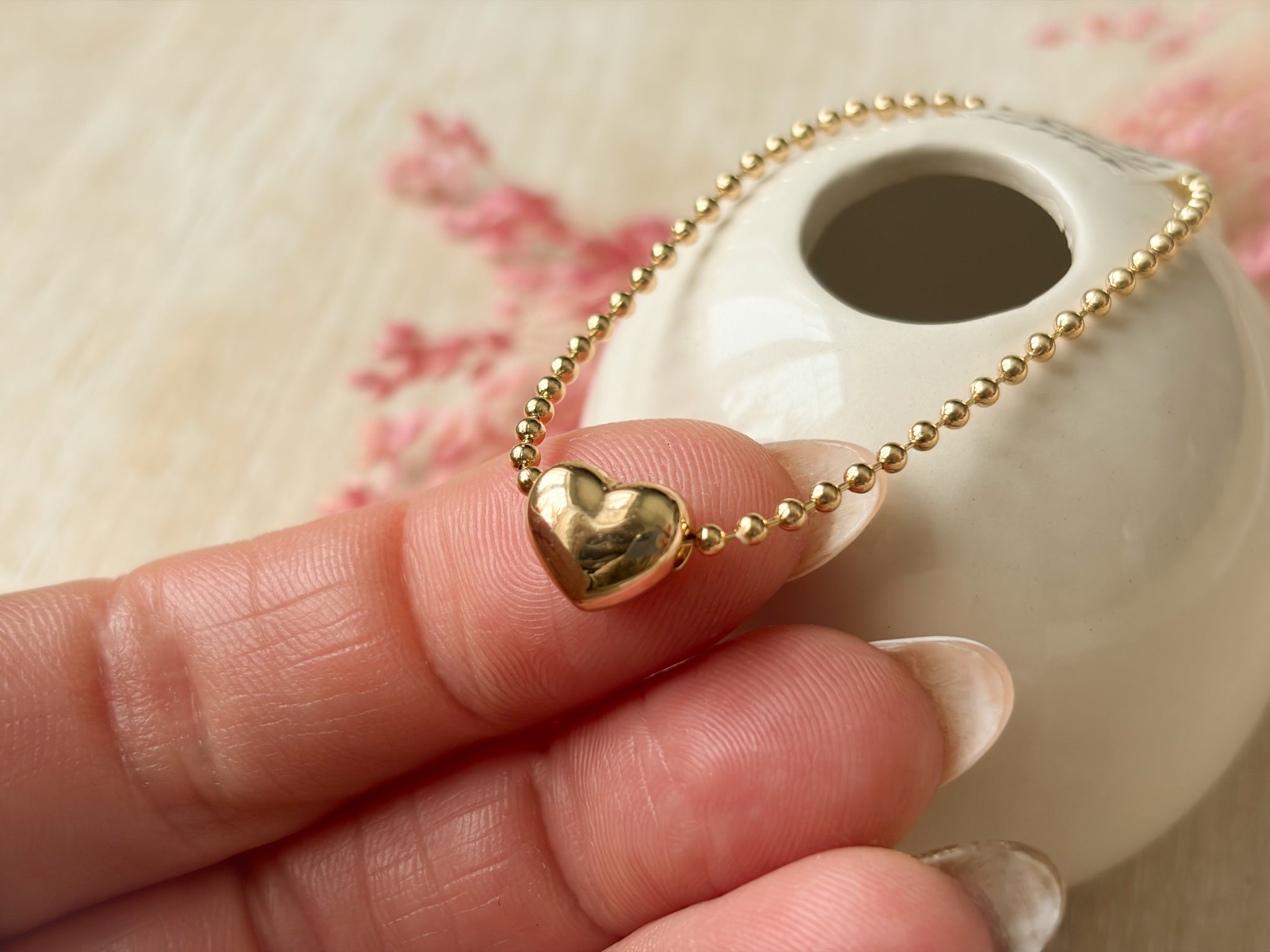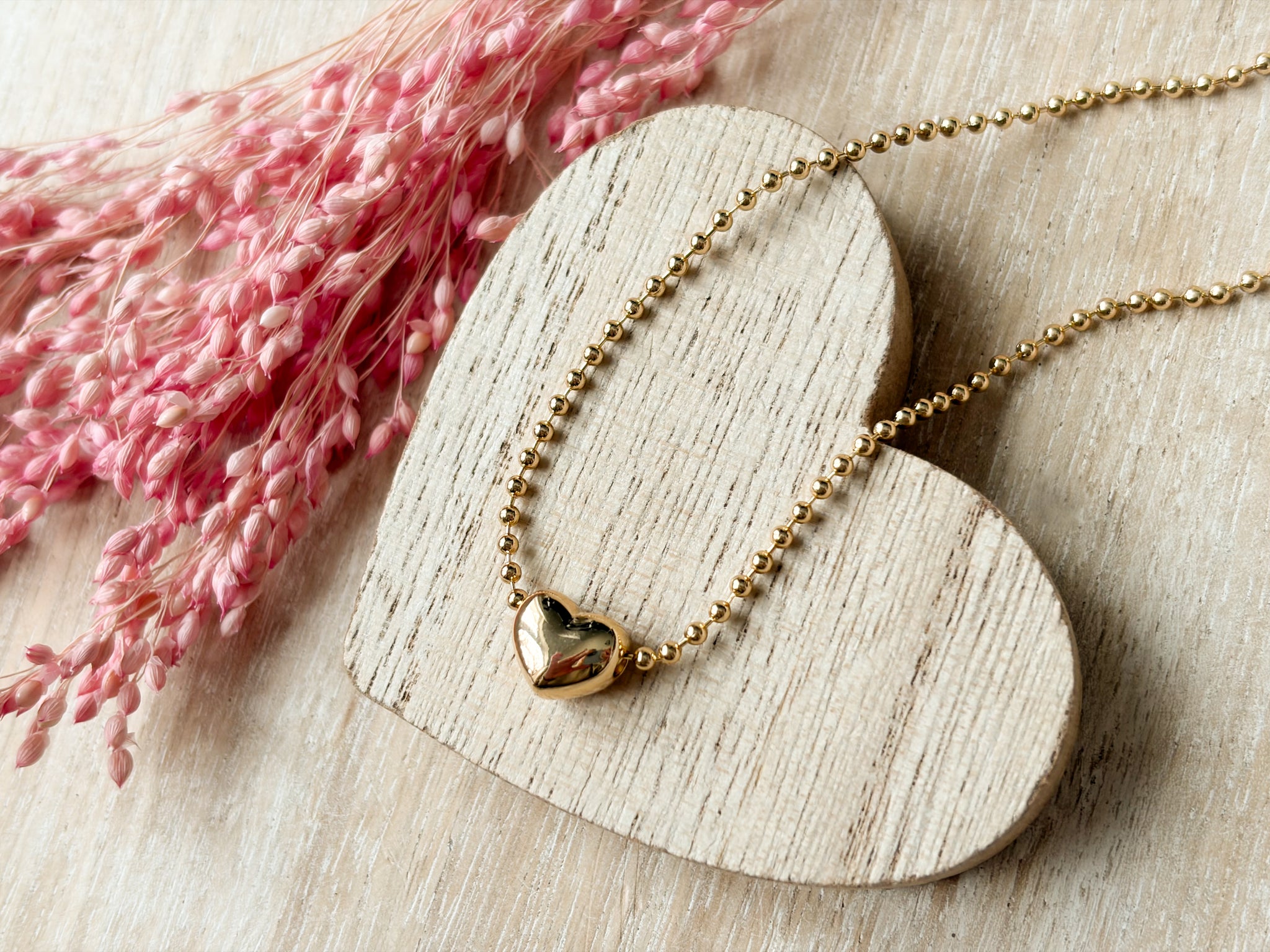 This 18” ball chain necklace features a puffed heart pendant that steals the spotlight. Finished in radiant 14K gold plating, it strikes the perfect balance between edgy and romantic. Nickel free