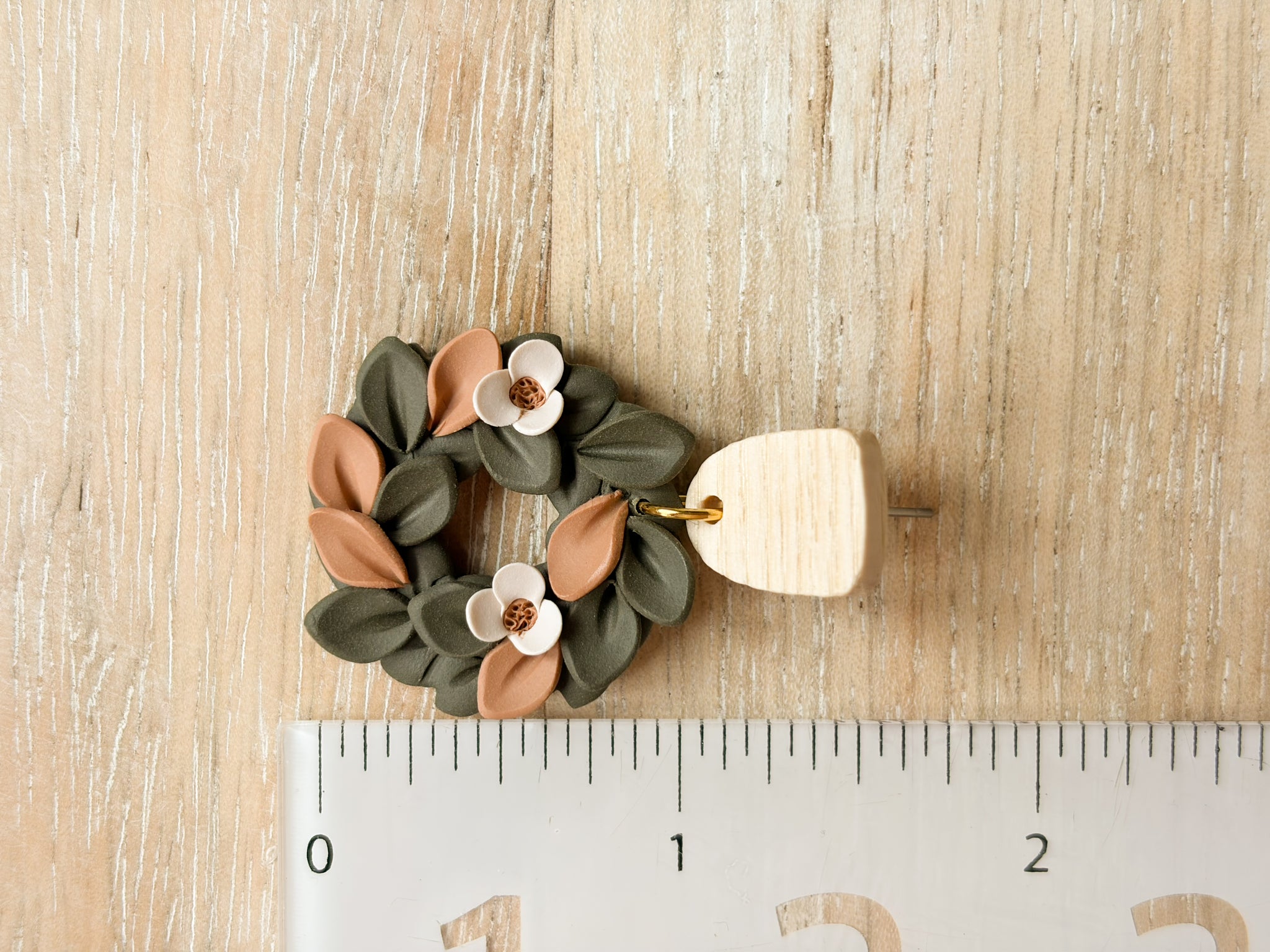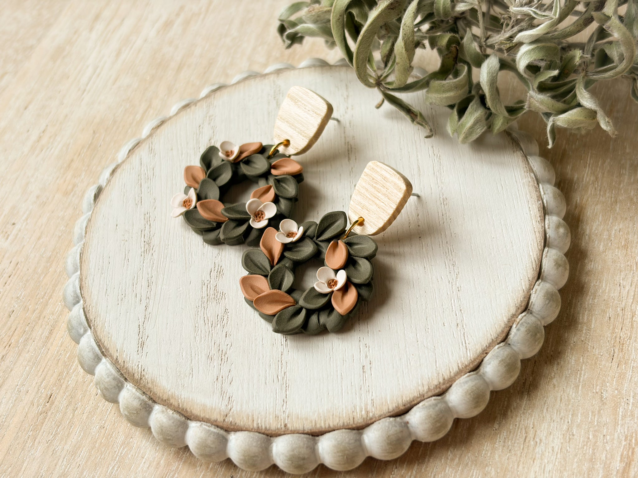 These handmade clay wreaths capture the magic of a vintage Christmas. Lightweight, nickel free, and beautifully detailed for a soft, nostalgic holiday look. The birch wood earring attachment is the perfect finishing touch.