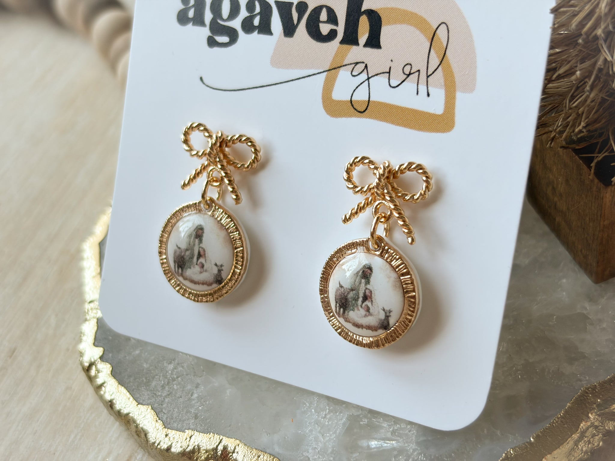 A beautiful itty bitty hand-painted watercolor scene of the Nativity, delicately crafted on polymer clay and sealed with a protective glossy finish for lasting shine. Topped with a charming bow for the perfect festive touch. Approx. half the size of our Nativity Earrings. Nickel free and 14K gold plated for comfort and quality.