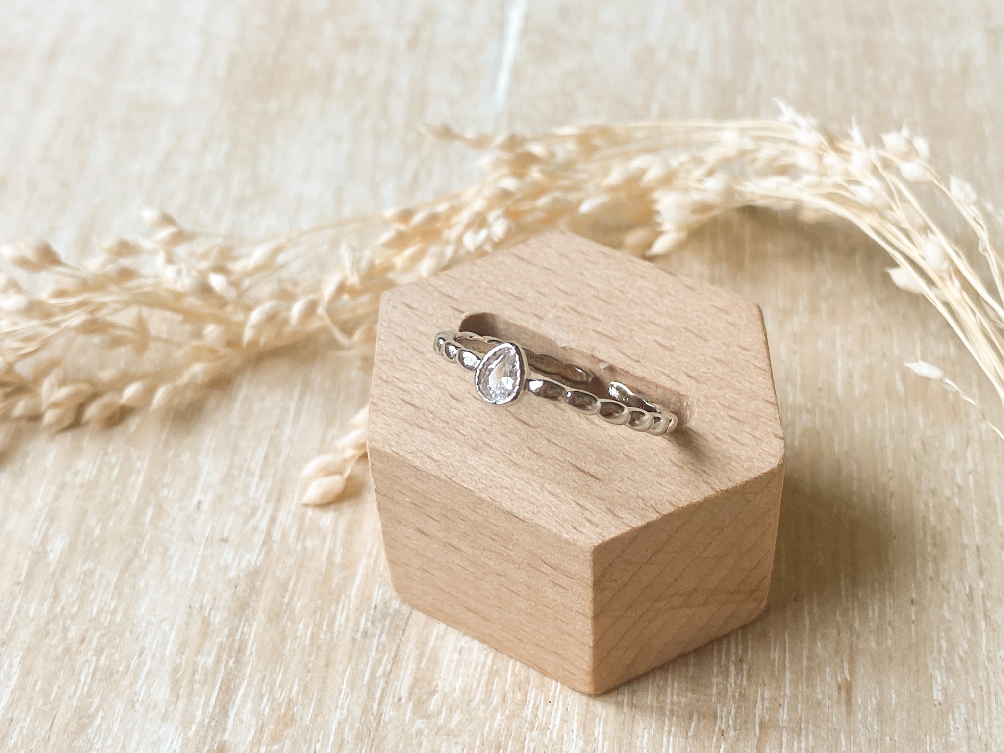 This ring is adjustable and has a pear shaped cubic zirconia stone in the centre. The band has a beaded like appearance.