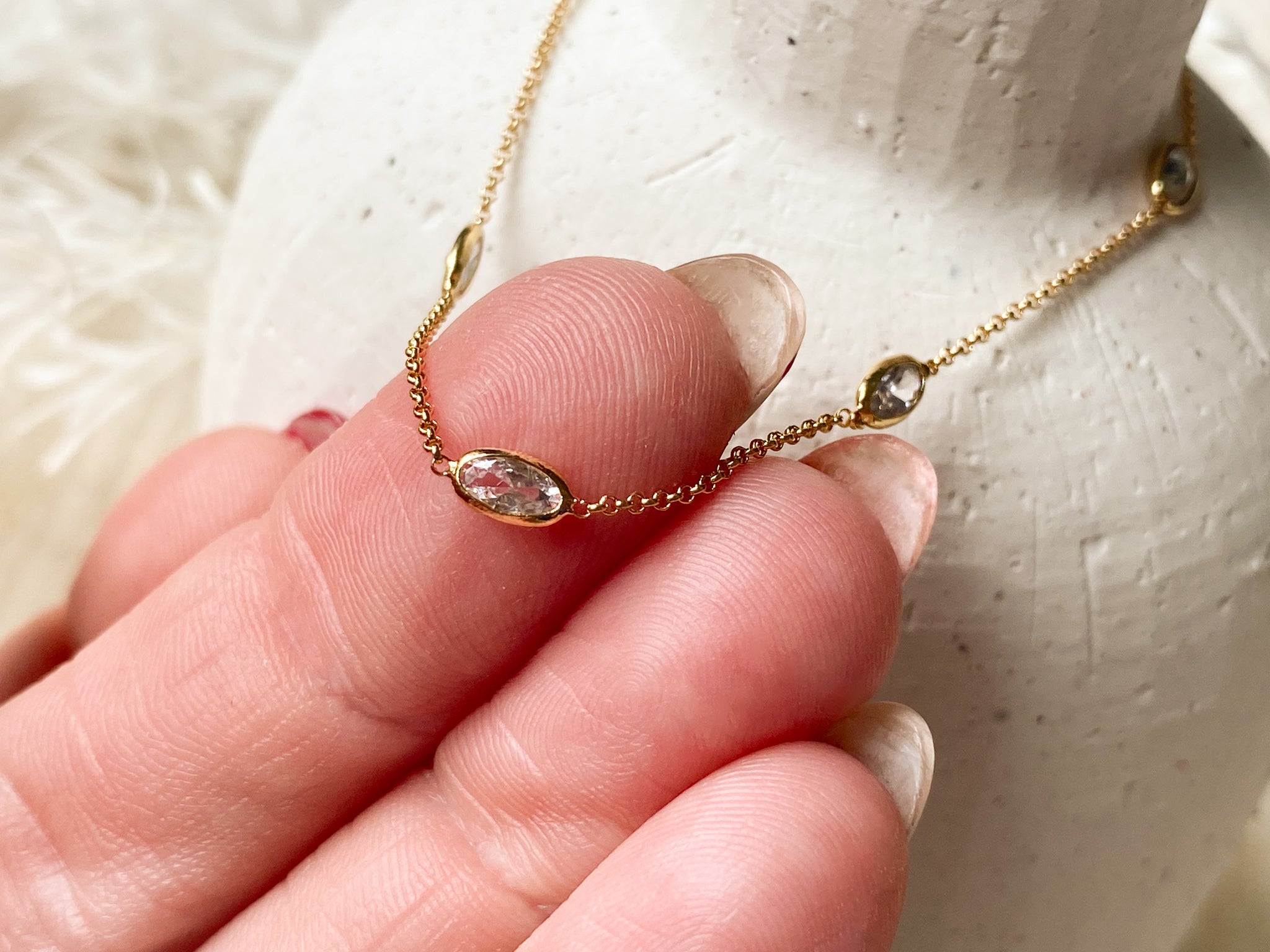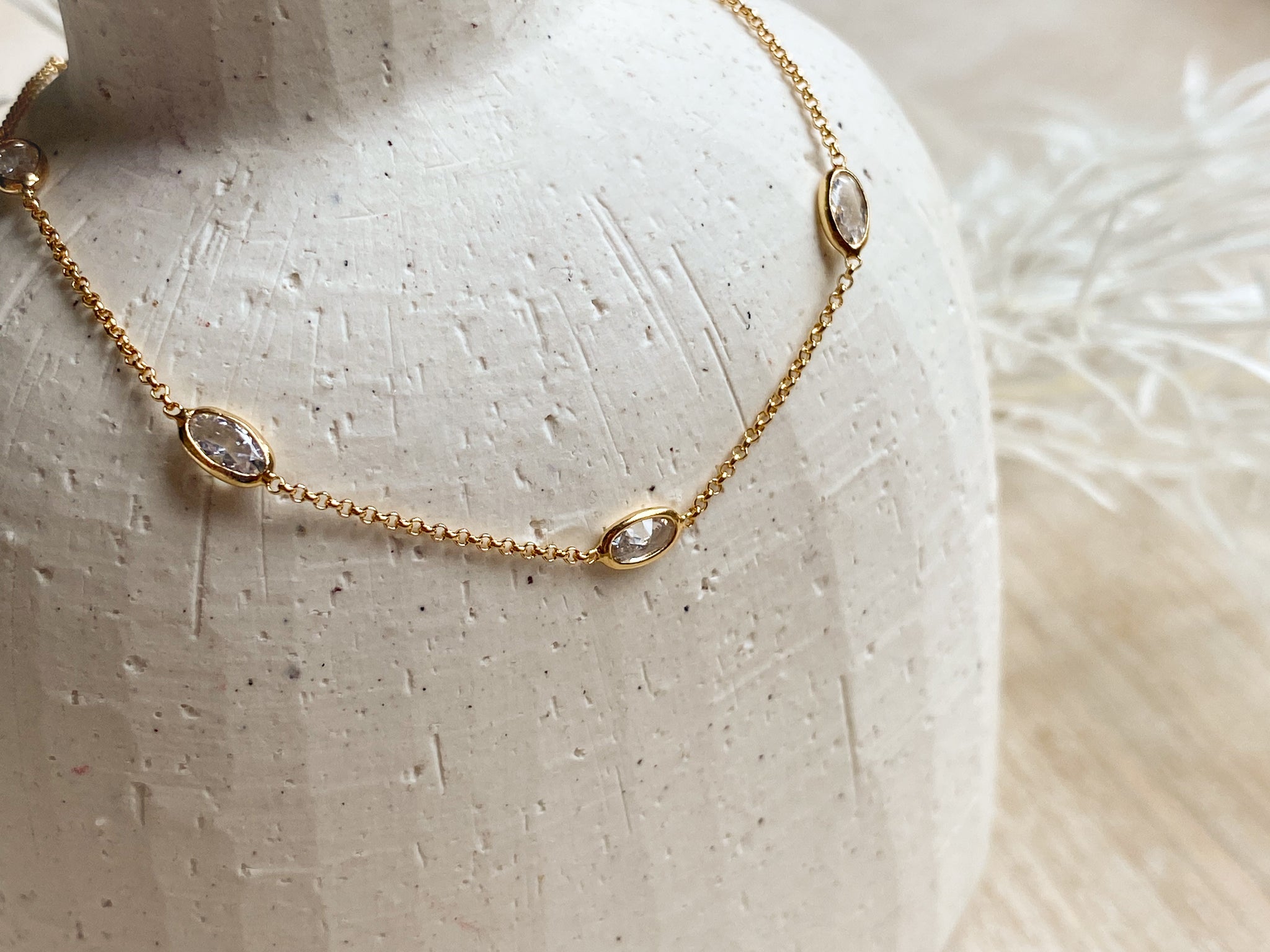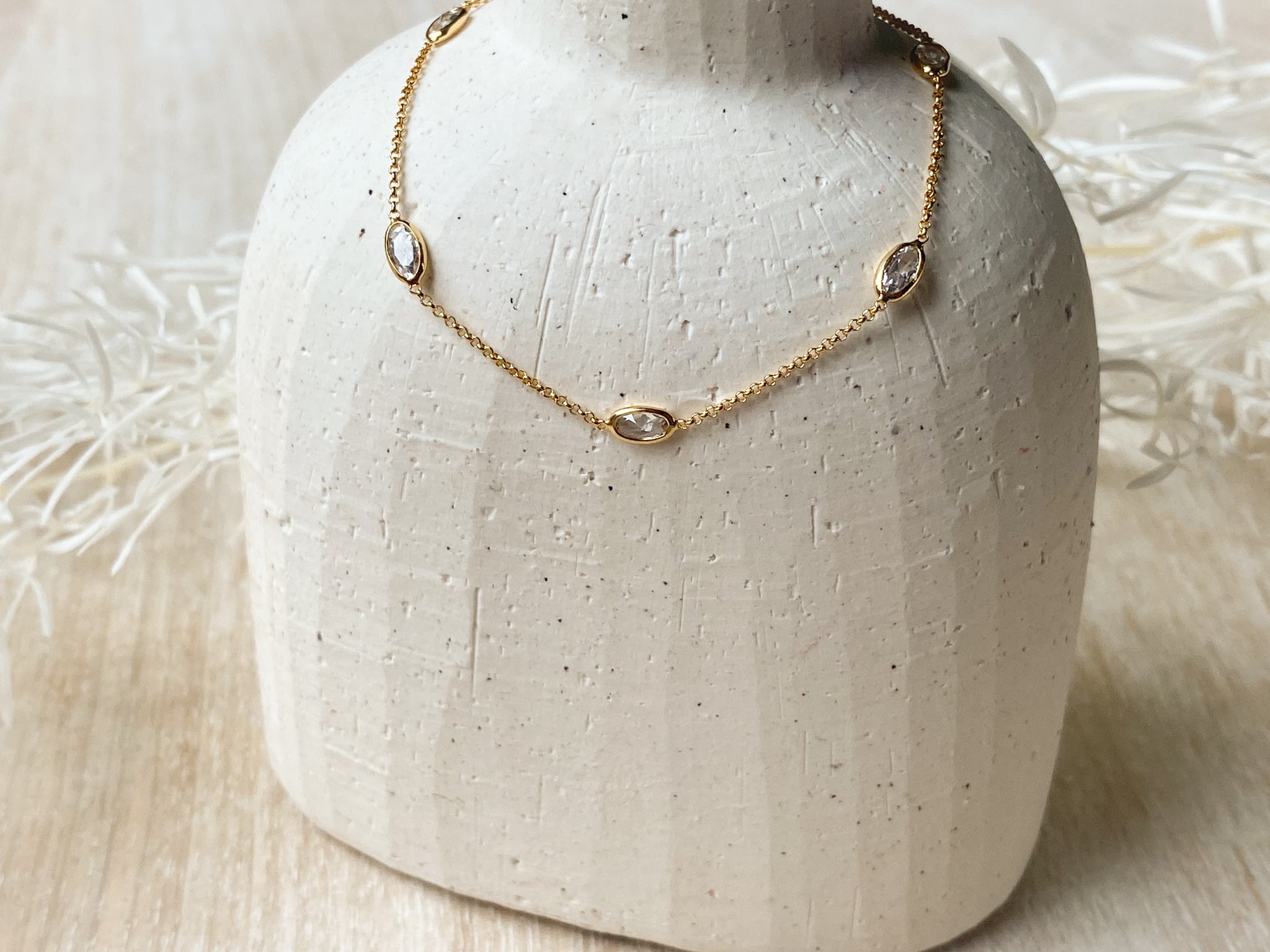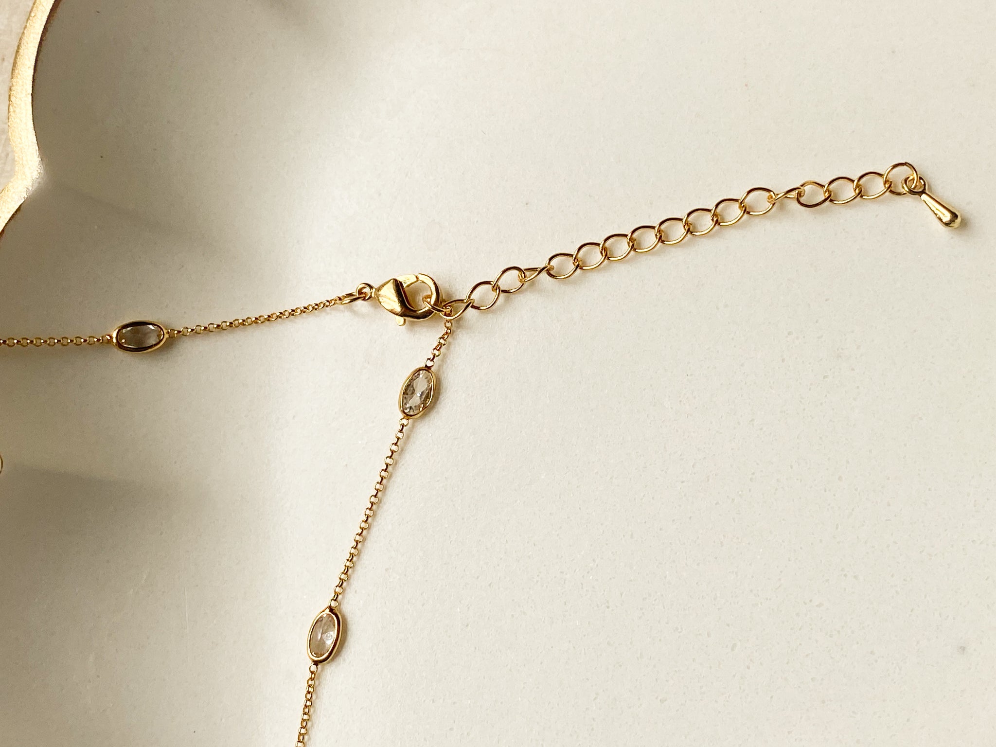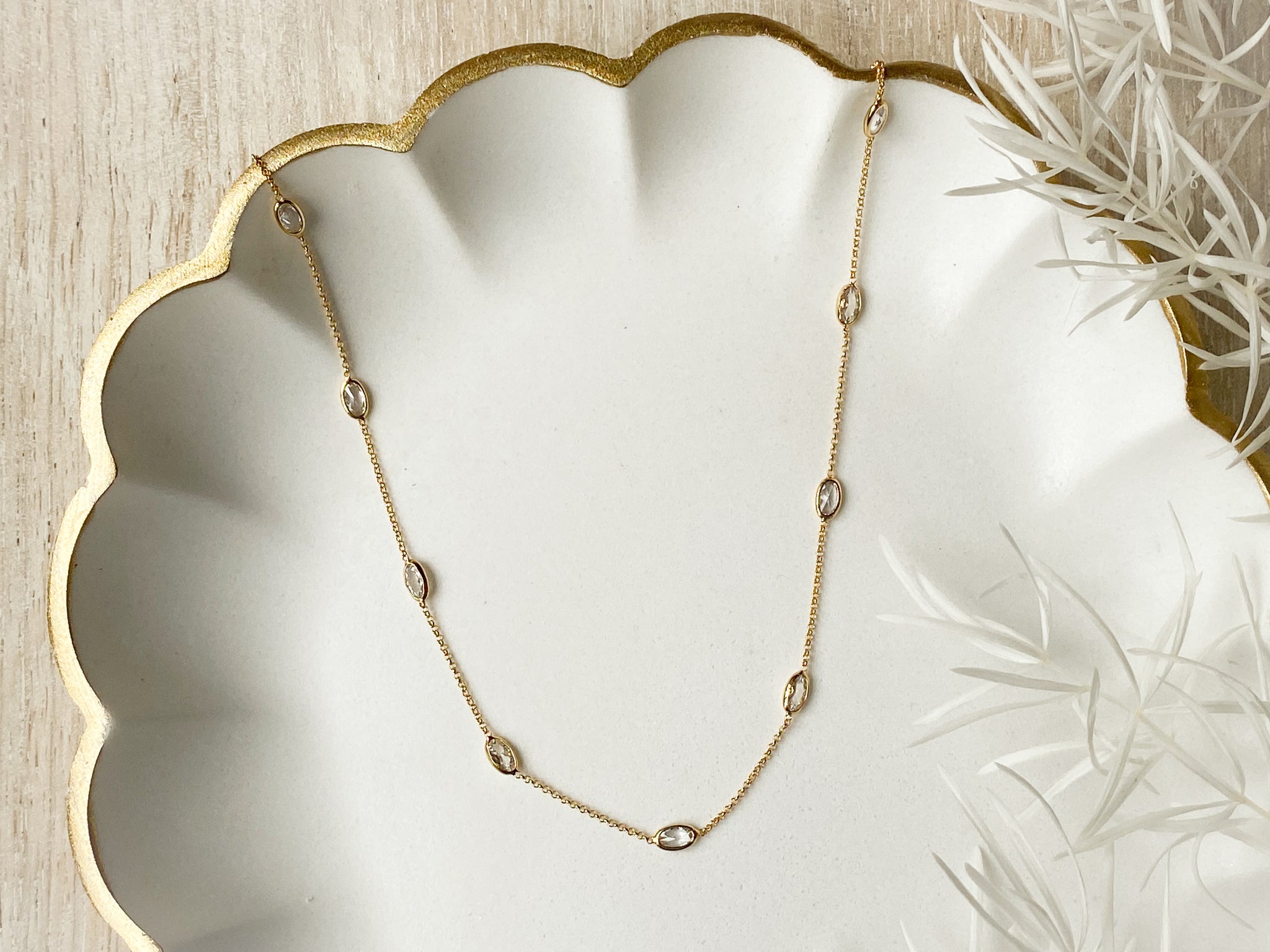 Elegant and effortlessly dainty, this 14K gold plated chain features shimmering oval-cut cubic zirconia stones spaced every 1.5 inches for just the right amount of sparkle. The 16” chain includes a 2” extender, allowing you to wear it at your perfect length. A timeless layering piece or a delicate standout on its own—nickel free and designed for everyday shine.