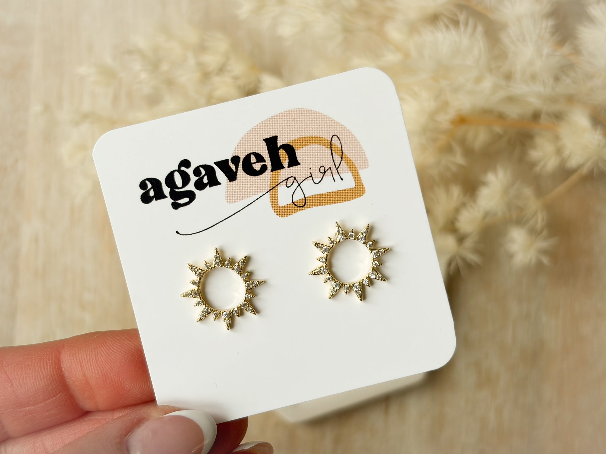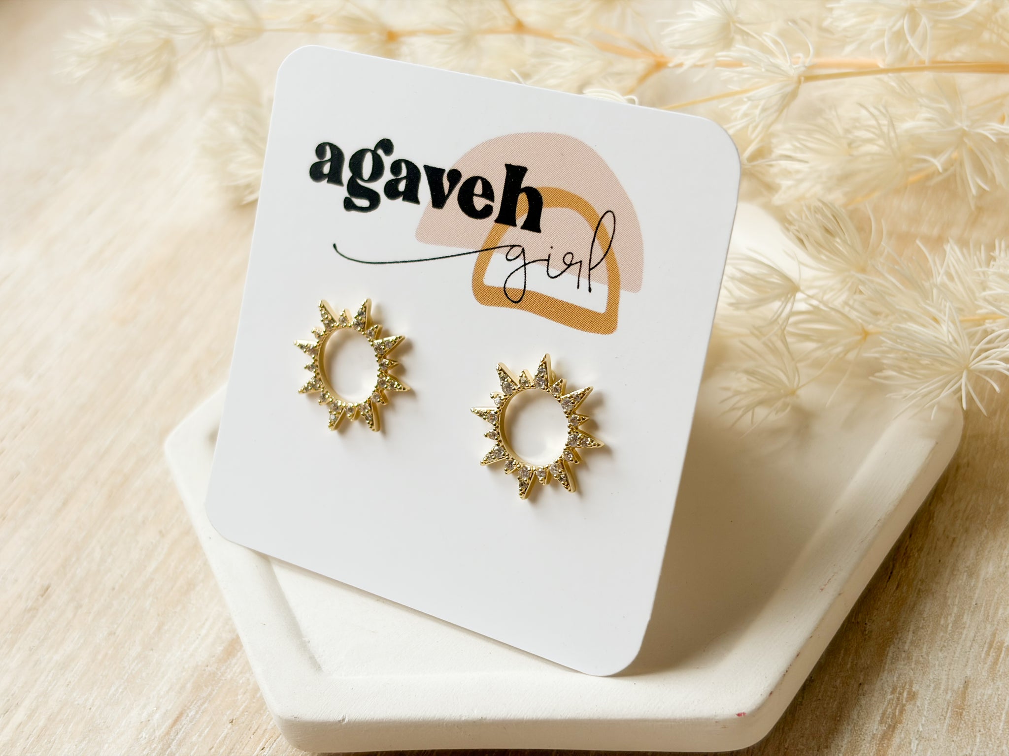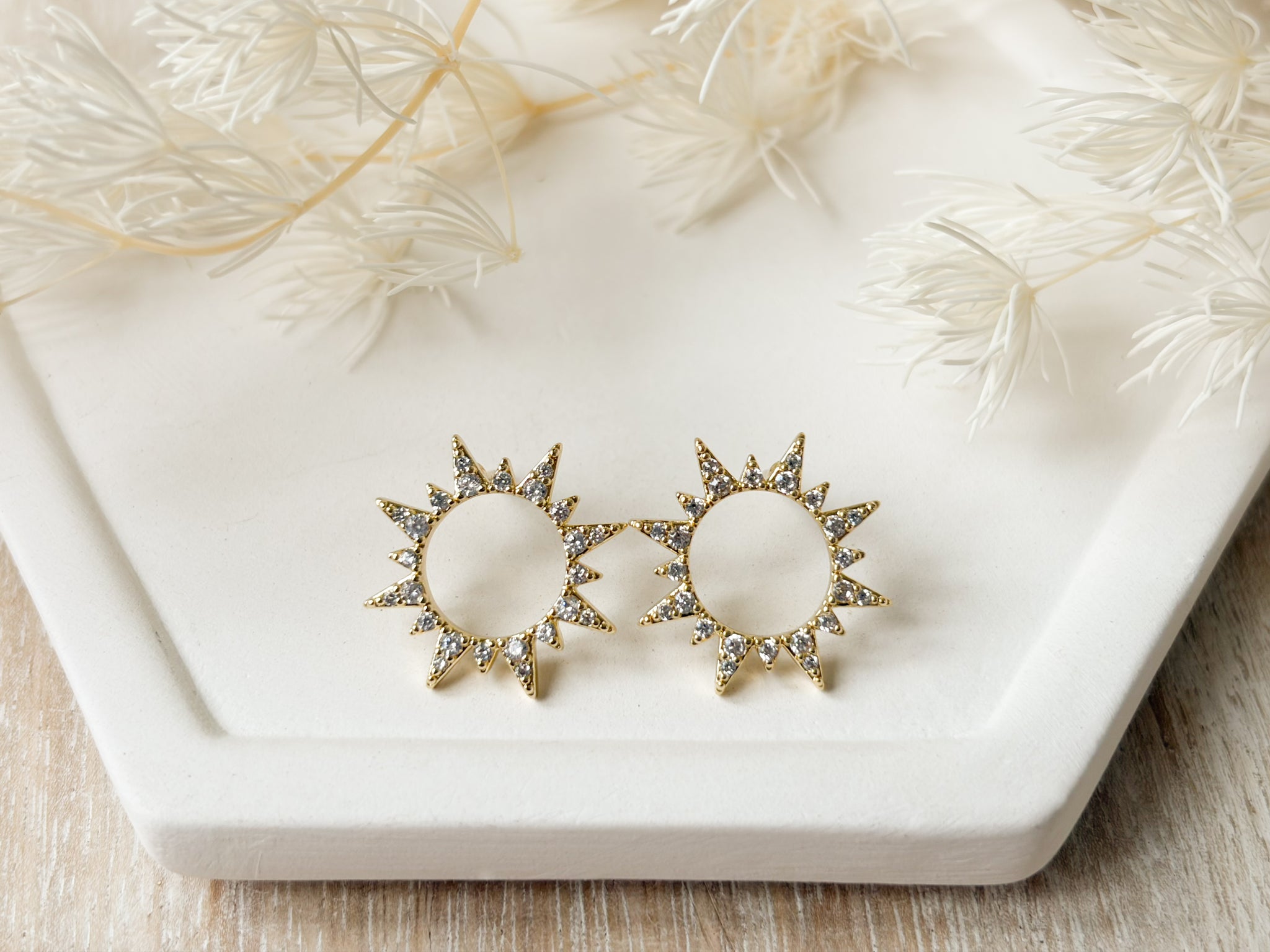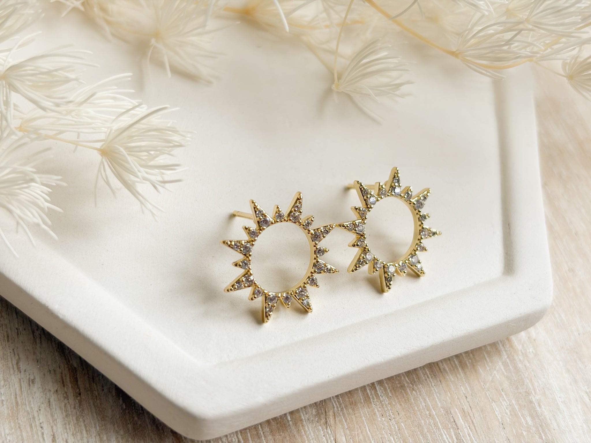 Shine bright with these radiant sol stud earrings, sparkling with cubic zirconia stones that catch the light from every angle. Measuring approximately 3/4”, they’re the perfect statement of warmth and brilliance. Nickel free and gold plated for lasting shine and comfort.