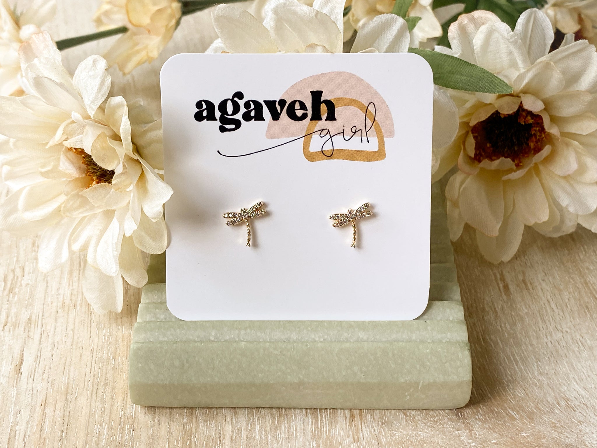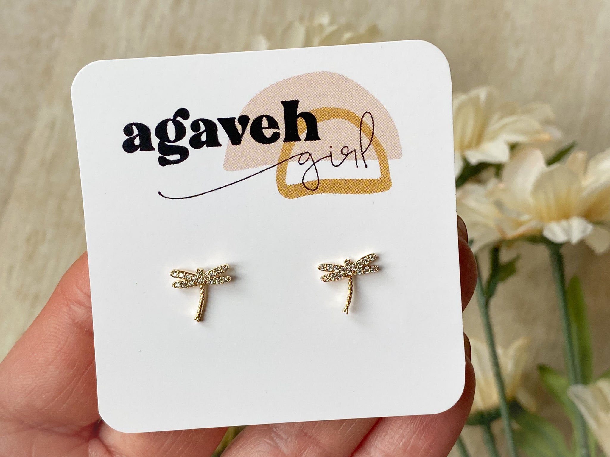 A unique dragonfly stud that has tiny cubic zirconia stones along its body and wings. These studs are 14K Gold plated and nickel free.