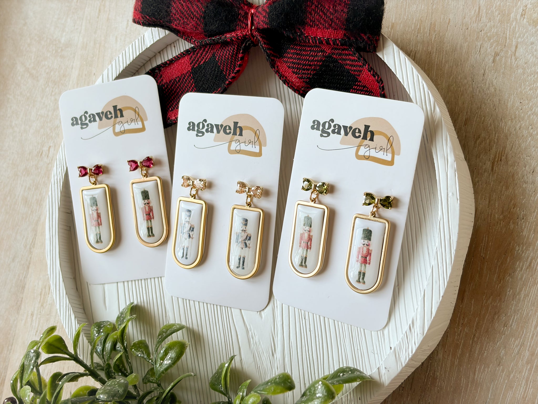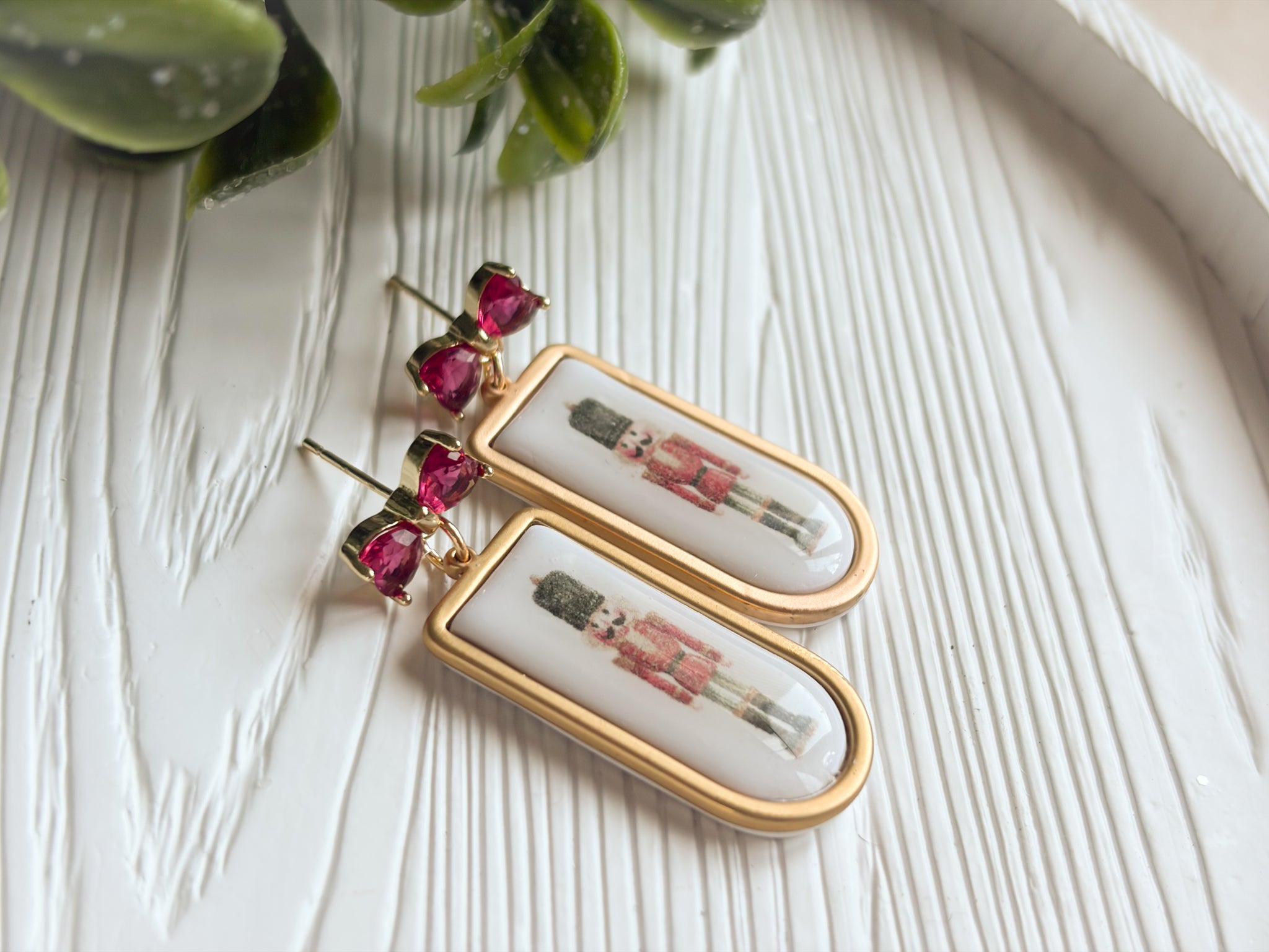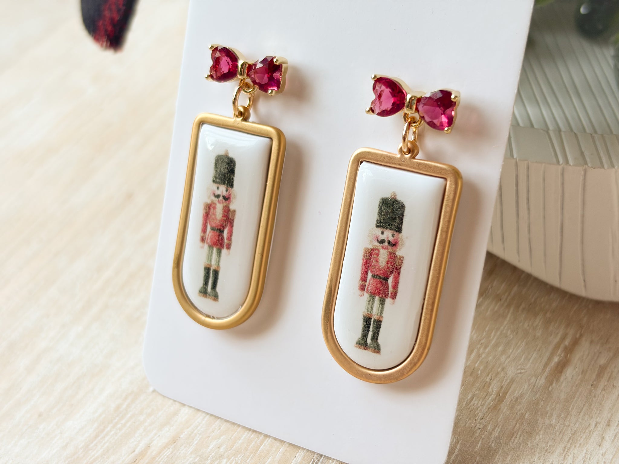 Bring a touch of holiday magic to your look with these charming dangle earrings featuring a watercolour-style nutcracker soldier. Each pair hangs from a sparkling bow stud, adding the perfect hint of shine and festive elegance. Available in three unique styles, these lightweight, nickel-free beauties are the sweetest way to celebrate the season.