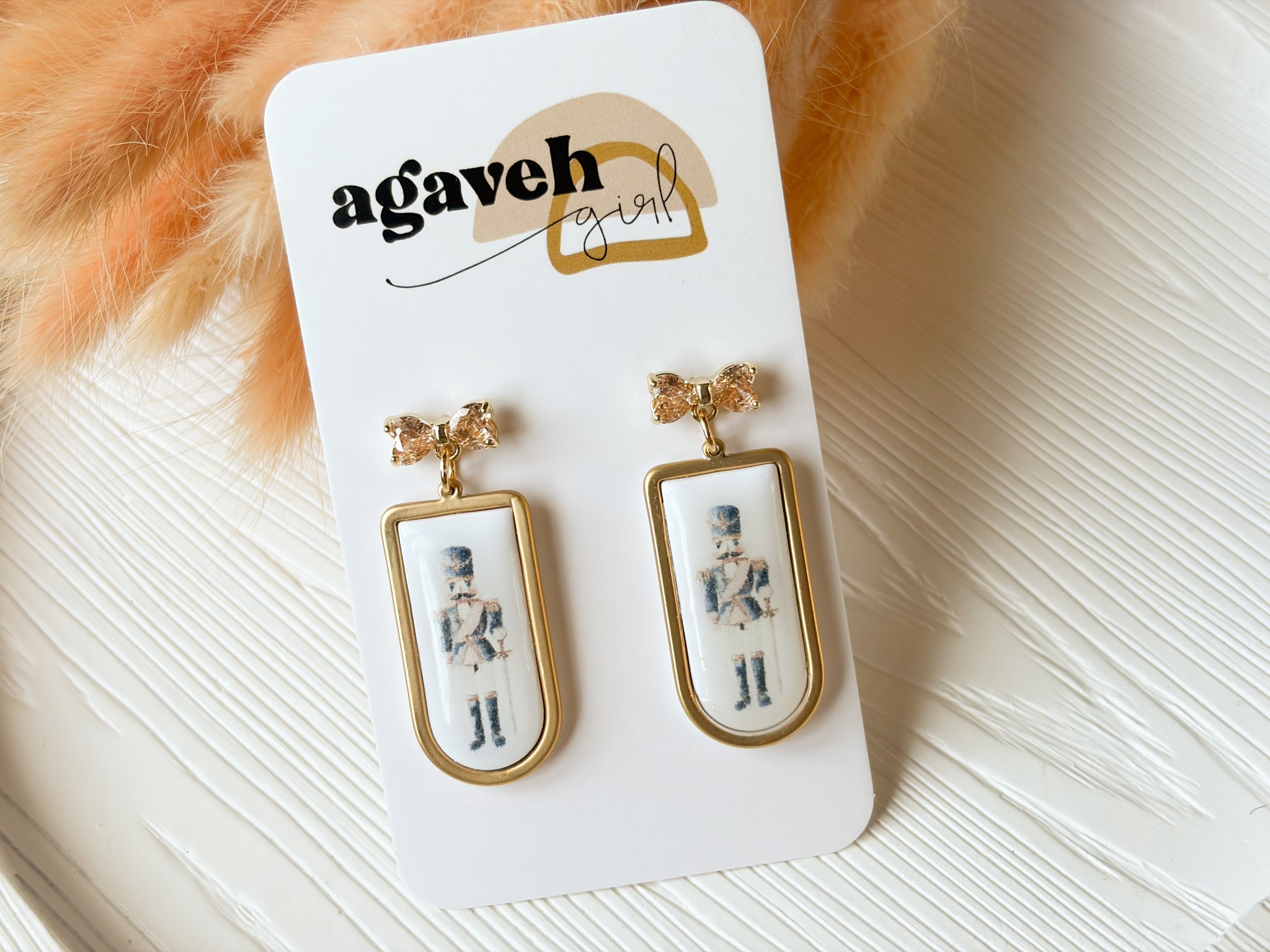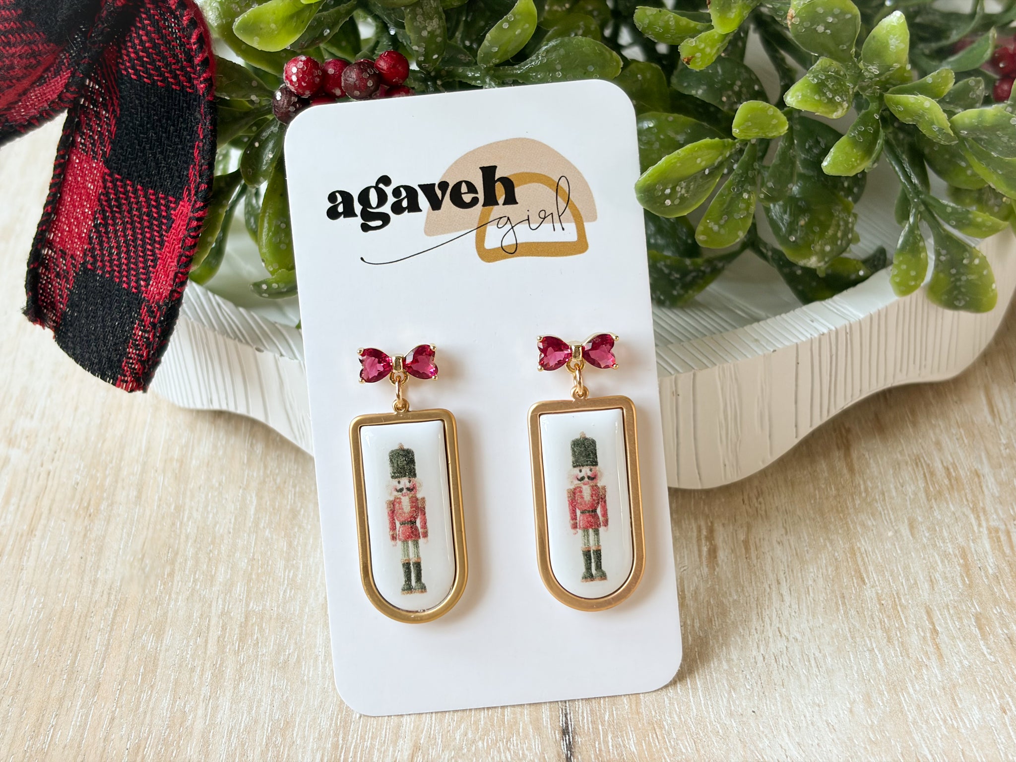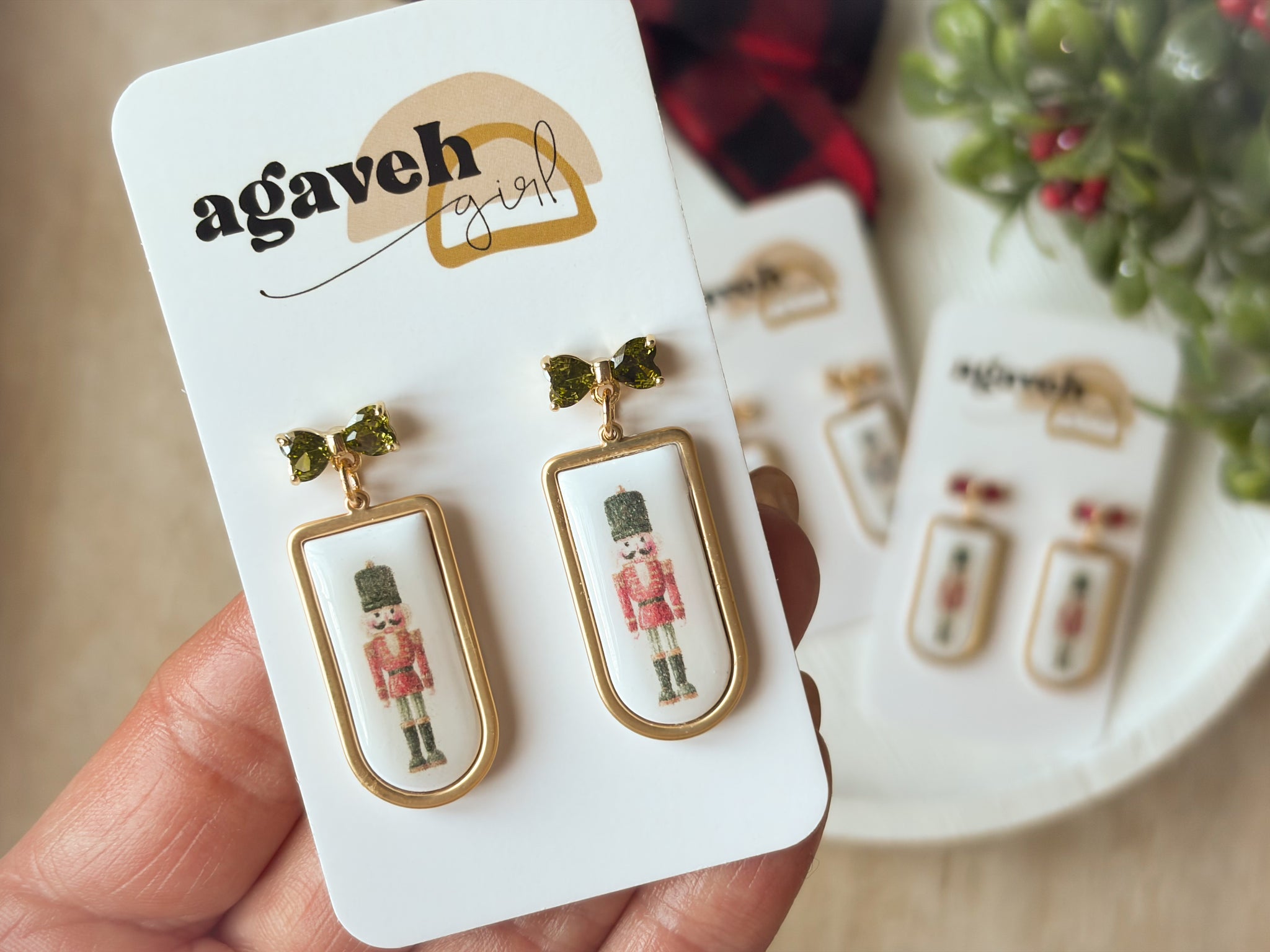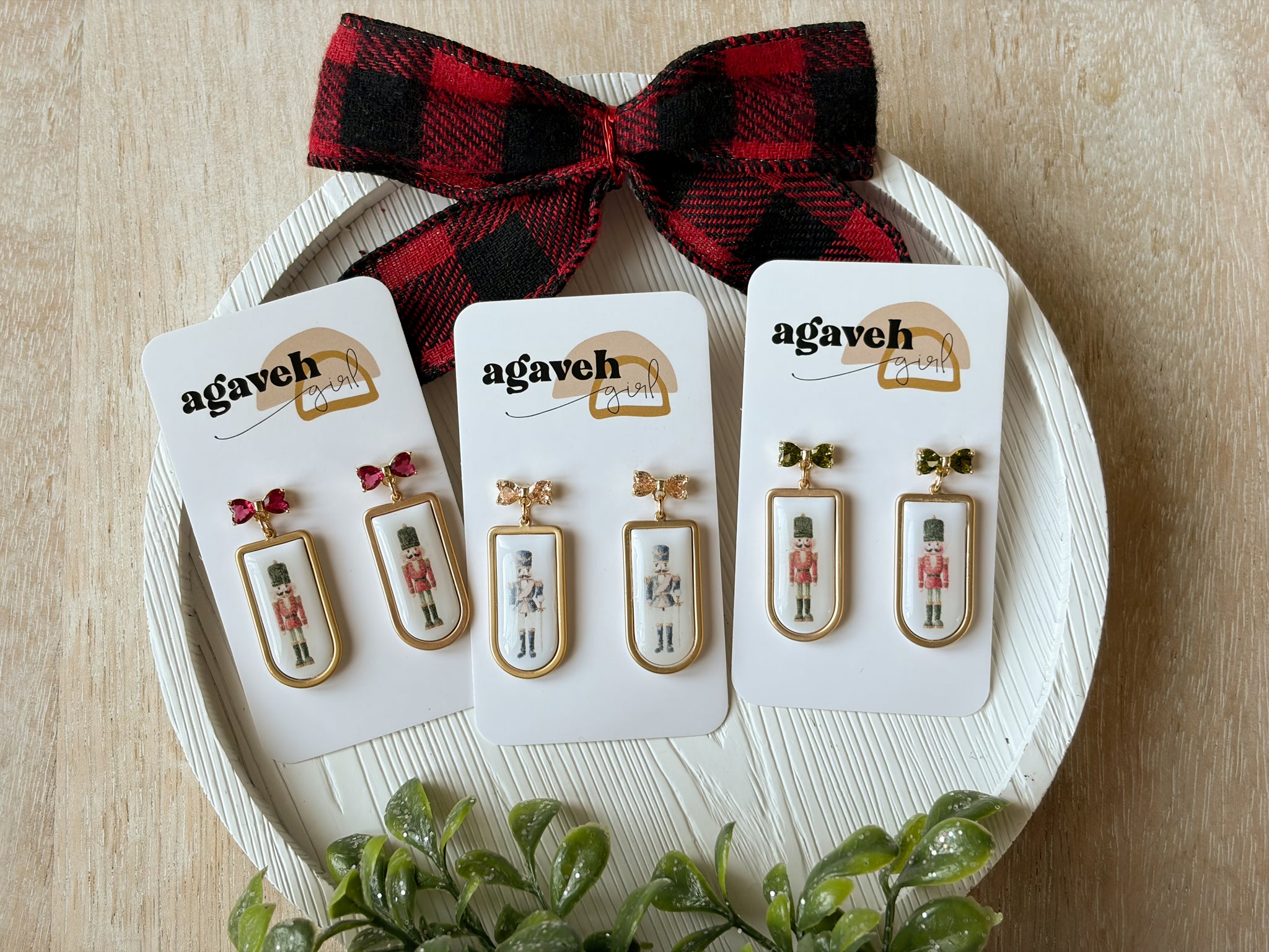 Bring a touch of holiday magic to your look with these charming dangle earrings featuring a watercolour-style nutcracker soldier. Each pair hangs from a sparkling bow stud, adding the perfect hint of shine and festive elegance. Available in three unique styles, these lightweight, nickel-free beauties are the sweetest way to celebrate the season.