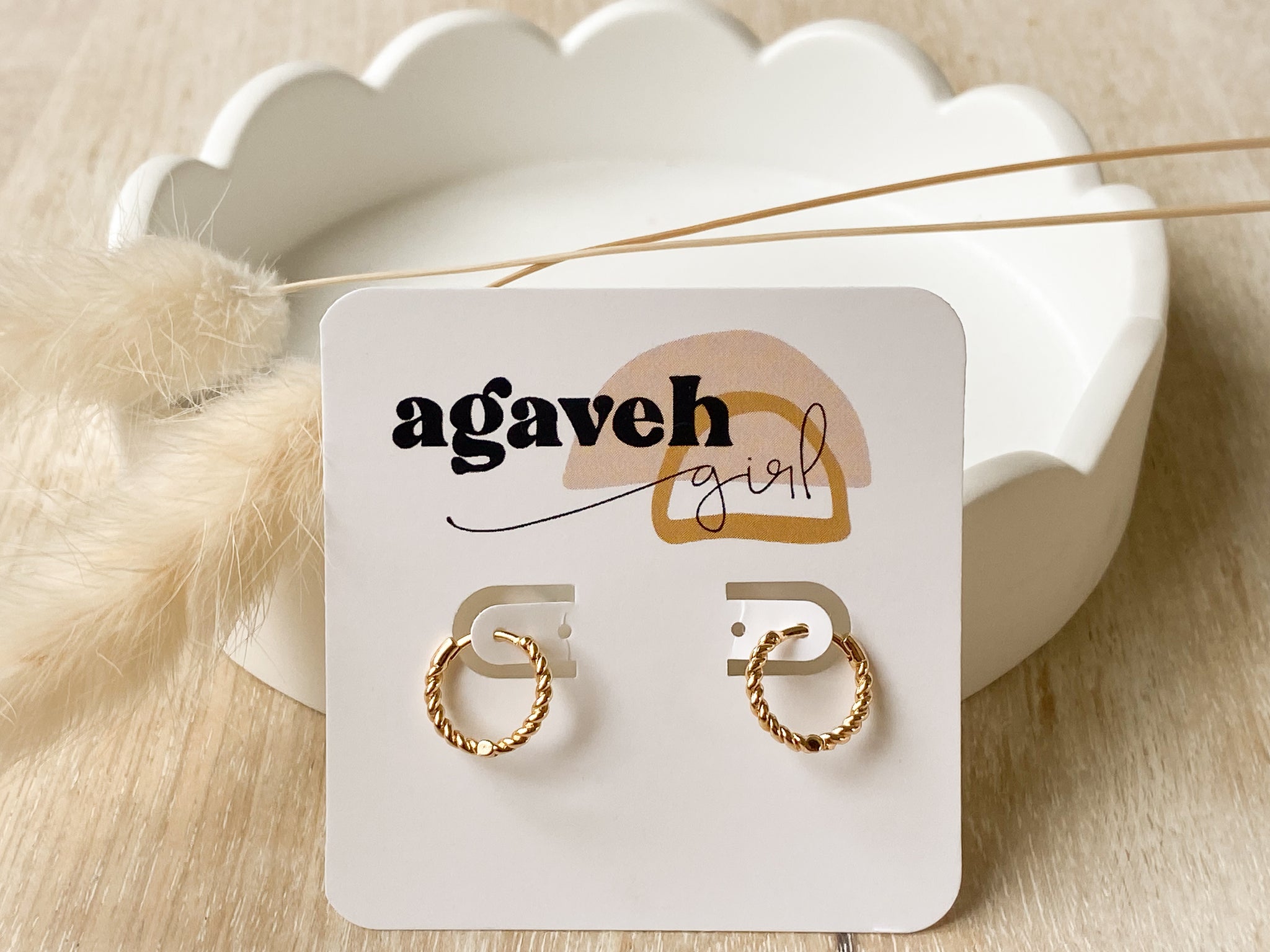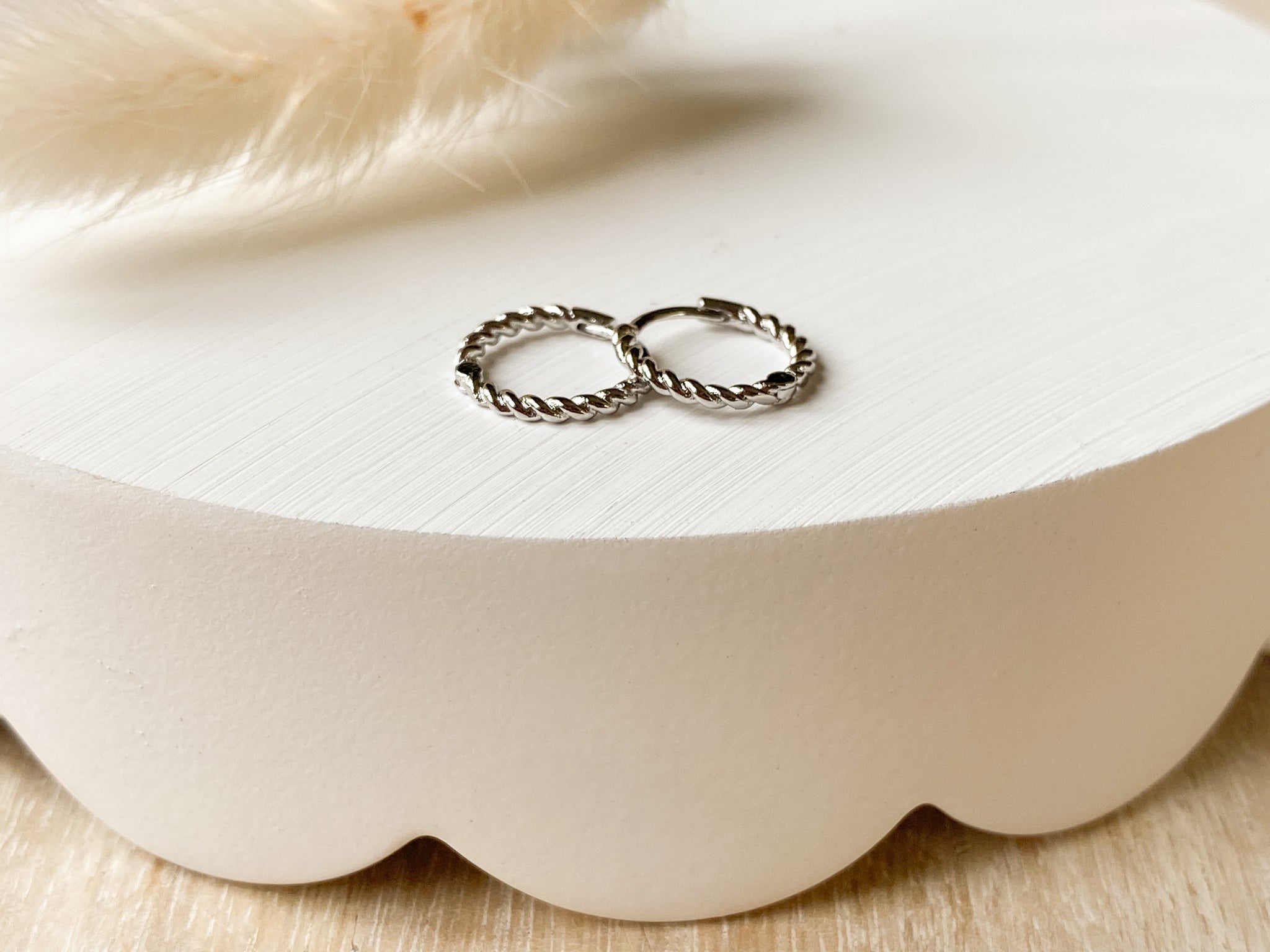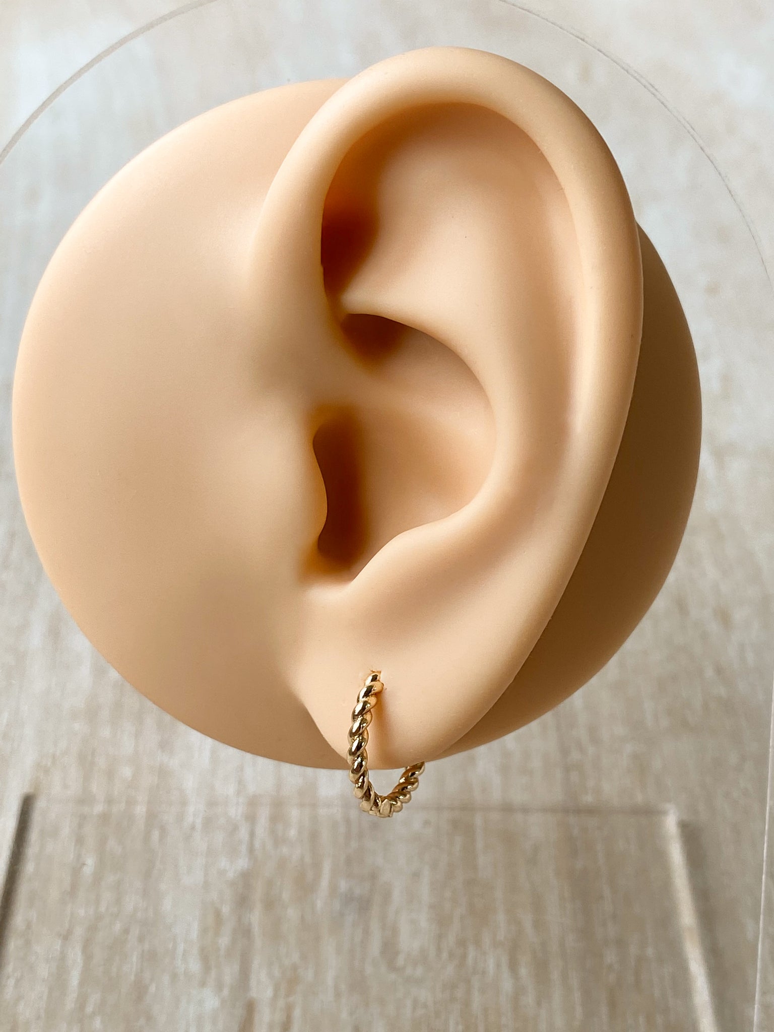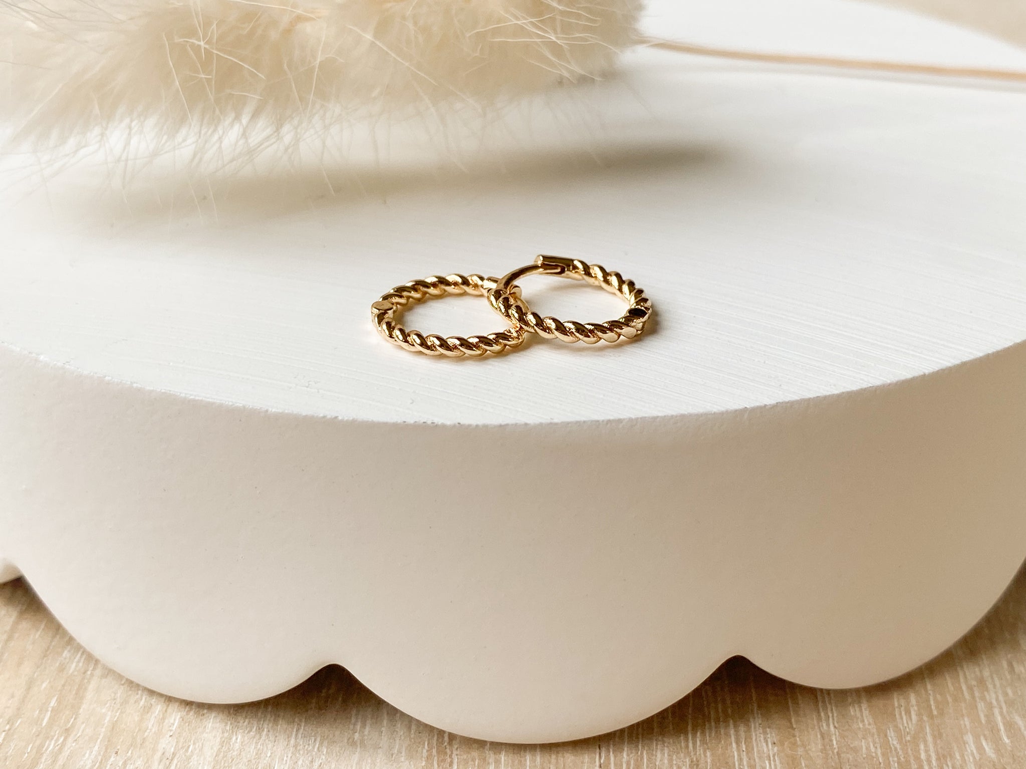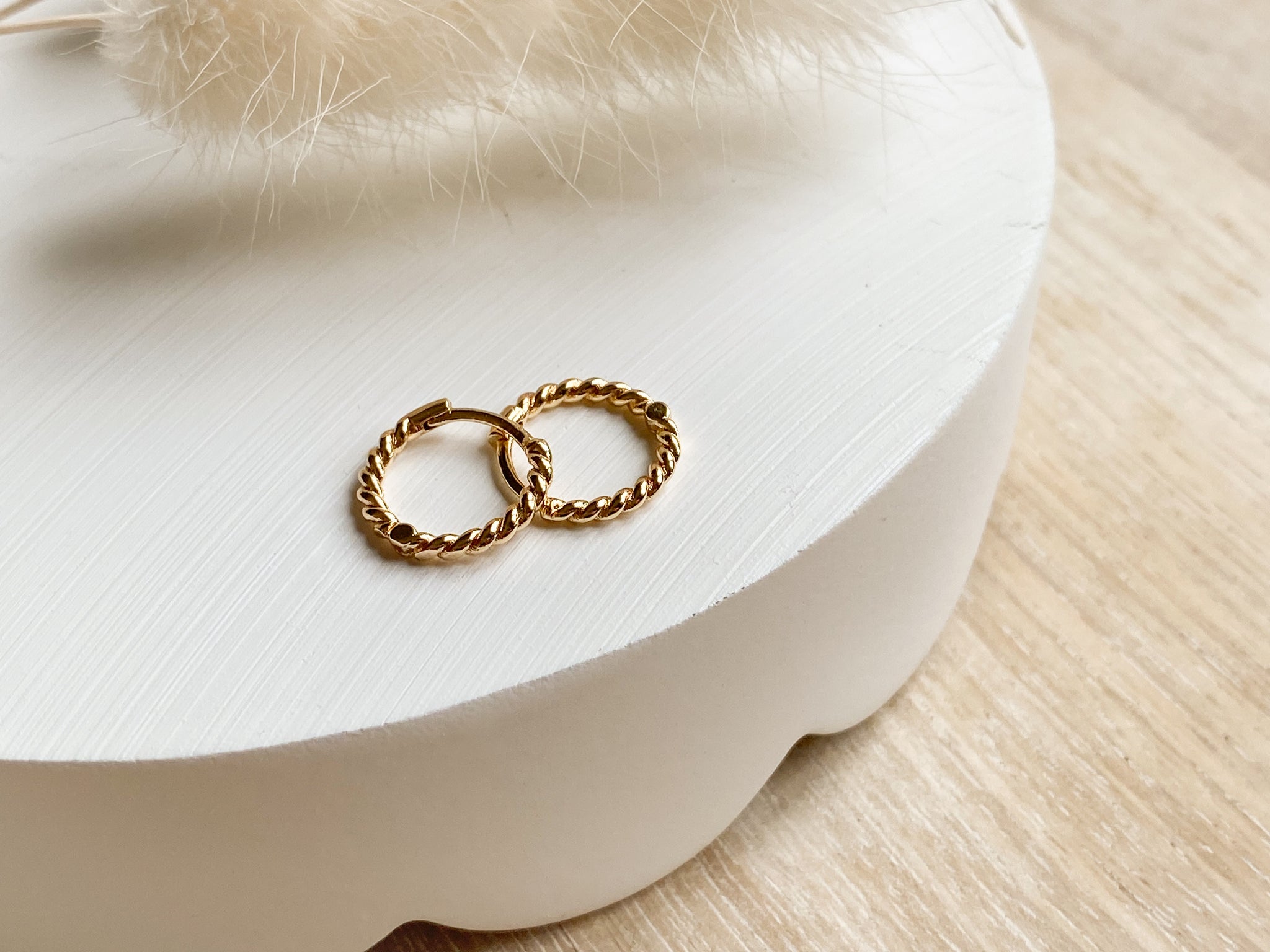 These are a simple 13mm twisted hoop that are comfortable, stylish, and available in both silver and gold. Nickel free and 14K gold plated.